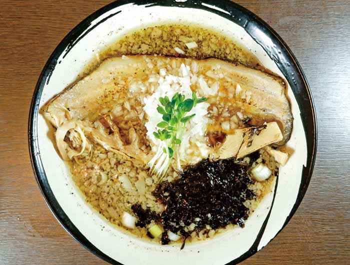 老舗とんかつ専門店「なには」では、醤油・節・味噌3種類の特製ラーメン、平日限定「三味(しゃみ)SOBA」が評判。写真は、進化系背脂醤油ラーメン1,000円。豚骨・鶏ガラで炊くスープに背脂の甘みとコク、スパイシーなアクセントを効かせ、炙り豚バラチャーシュー、炙り穂先メンマ、磯のり、刻み玉ねぎと多彩なトッピングで食感と香りに奥ゆきを持たせた。麺は、なめらかな舌触りと歯切れ良い国産小麦ストレート麺。ハイレベルな本格ラーメンに驚く。 |