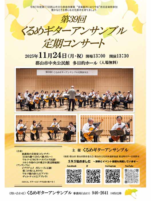 第39回くるめギターアンサンブル定期コンサート11月24日(月・祝)13:00〜入場無料