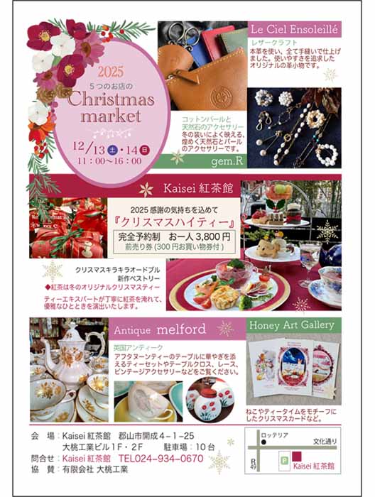 「5つのお店のクリスマスマーケット」は、12月13日(土)14日(日)11時から16時までKaisei紅茶館(郡山市開成4-1-25大桃工業ビル)で開催。参加店は、メルフォード(英国アンティーク雑貨)、gem.R(コットンパールと天然石のアクセサリー)、ル シエル アンソレイエ(レザークラフト)、ハニーアートギャラリー(Xmasカード)、Kaisei紅茶館では、Xmasハイティー(オードブル・食事・スイーツ・紅茶・3,800円・完全予約制の前売券販売中)を提供。 |