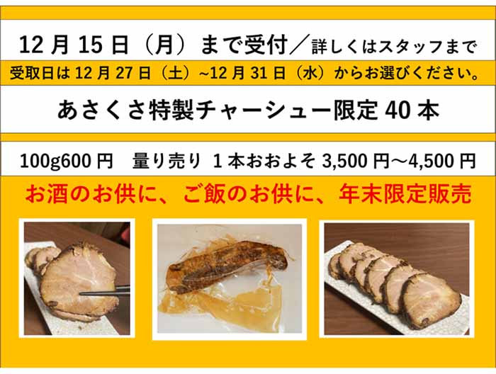 「特製チャーシュー」年末限定40本予約販売。12月15日(月)まで予約受付中。