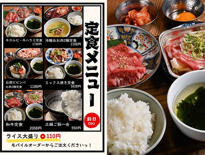 A5ランクの和牛をお値打ち価格で堪能できる「焼肉ホルモン たけ田 朝日店」(郡山市桑野3-157-5)では、「定食メニュー」が新登場。「牛カルビ・牛ハラミ定食」(1,738円)、「冷麺&お肉2種定食」(1,188円)、「石焼ビビンバお肉2種定食」(1,188円)、「ミックス焼き定食」(1,628円)、「和牛定食」(2,068円)など、5種類の定食メニューを終日提供中。営業時間は、平日17時から23時、土日祝12時から23時。 |