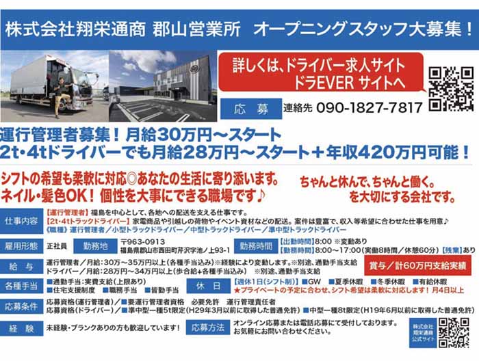 郡山営業所オープニングスタッフ大募集!電話応募、オンライン応募にて受付運行管理者月給30万円〜スタート、2t・4tドライバーも月給28万円〜スタート+年収420万円可能!